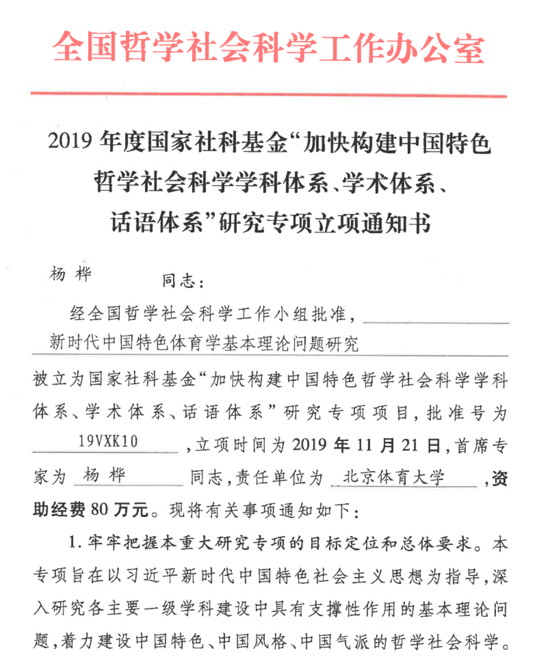 近日,经全国哲学社会科学工作小组批准,由Beat365杨桦教授担任首席专家的“新时代中国特色体育学基本理论问题研究”被批准为国家社科基金“加快构建中国特色哲学社会科学学科体系、学术体系、话语体系”重大研究专项。
